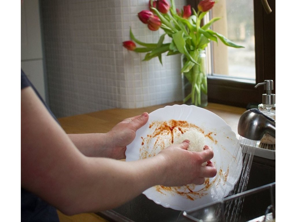 Rýchlo vysychá, preto je skvelou pomocníčkou pri umývaní riadov. Slúži ako hubka na riad a čiastočne aj ako drátenka. Na rozdiel od plastových hubiek vôbec nesmrdí ani po niekoľkých týždňoch používania - samozrejme, treba ju po použití vždy nechať vyschnúť. Nezachytávajú sa v nej zvyšky jedla - ak sa to náhodou stane, dajú sa ľahko vytriasť.