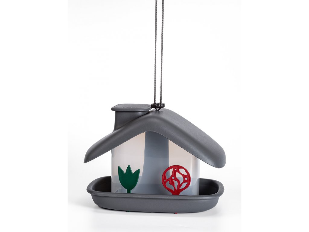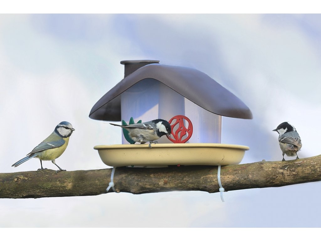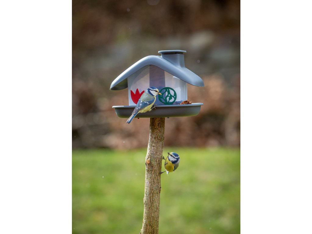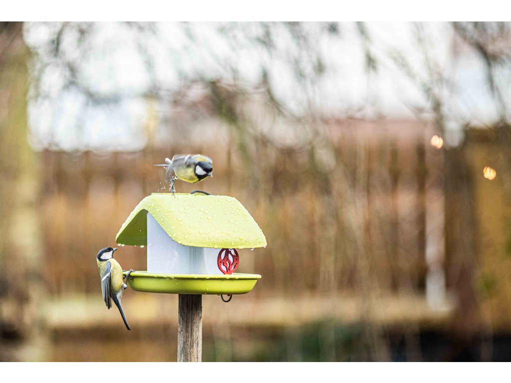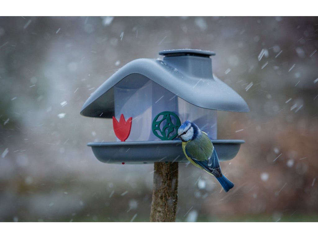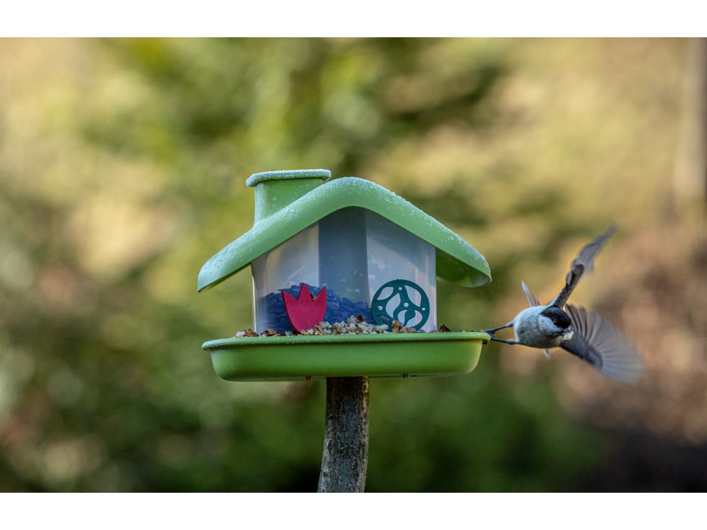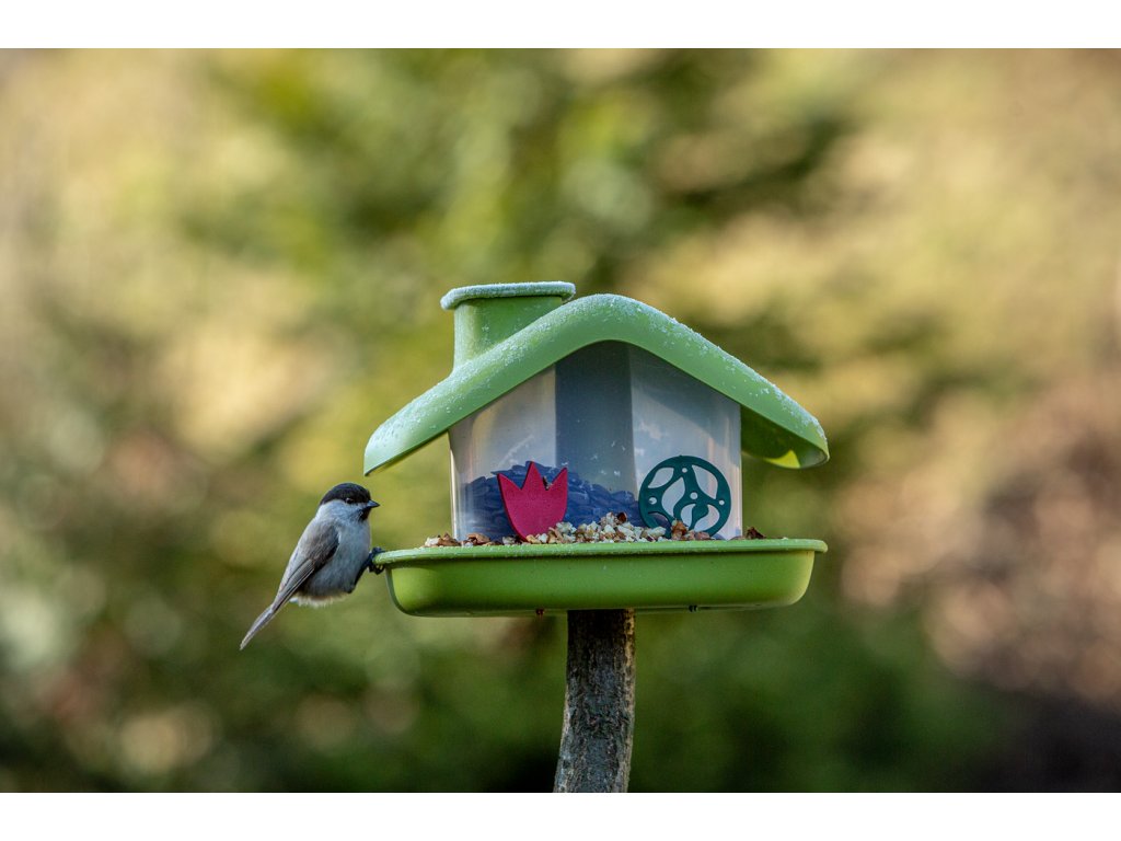 Dobre vymyslená konštrukcia umožňuje jednoduché doplňovanie kŕmidla odklopením veka komína.