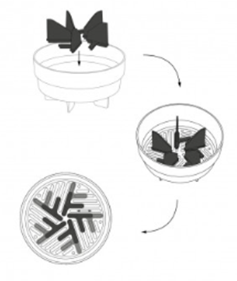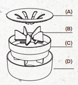 - do hlbokého sitka (C) zacvakneme variabilné rebierka (B) podľa veľkosti zeleniny. Čím ďalej od stredu sitka rebierka umiestňujeme, tým väčší priestor sa vytvára uprostred hlbokého sitka (C),