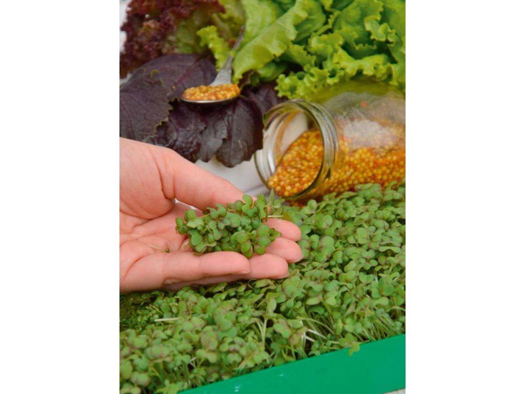 PESTOVANIE MIKROZELENINY: POZOR! Substrát by nemal byť počas celej kultivácie príliš vlhký. 1. Plochú nádobu naplňte zeminou, potom ju zarovnajte a zalejte. 2. Semená nasypte husto po celom povrchu. 3. Dvakrát denne pokropte vodou a pestujte 2-3 týždne. Rastliny zrežte, keď vytvoria prvé listy.