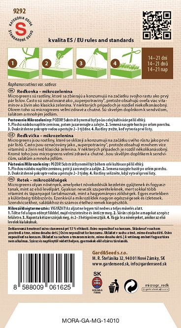 PESTOVANIE MIKROZELENINY: POZOR! Substrát by nemal byť počas celej kultivácie príliš vlhký. 1. Plochú nádobu naplňte zeminou, potom ju zarovnajte a zalejte. 2. Semená nasypte husto po celom povrchu. 3. Dvakrát denne pokropte vodou a pestujte 2-3 týždne. Rastliny zrežte, keď vytvoria prvé listy.