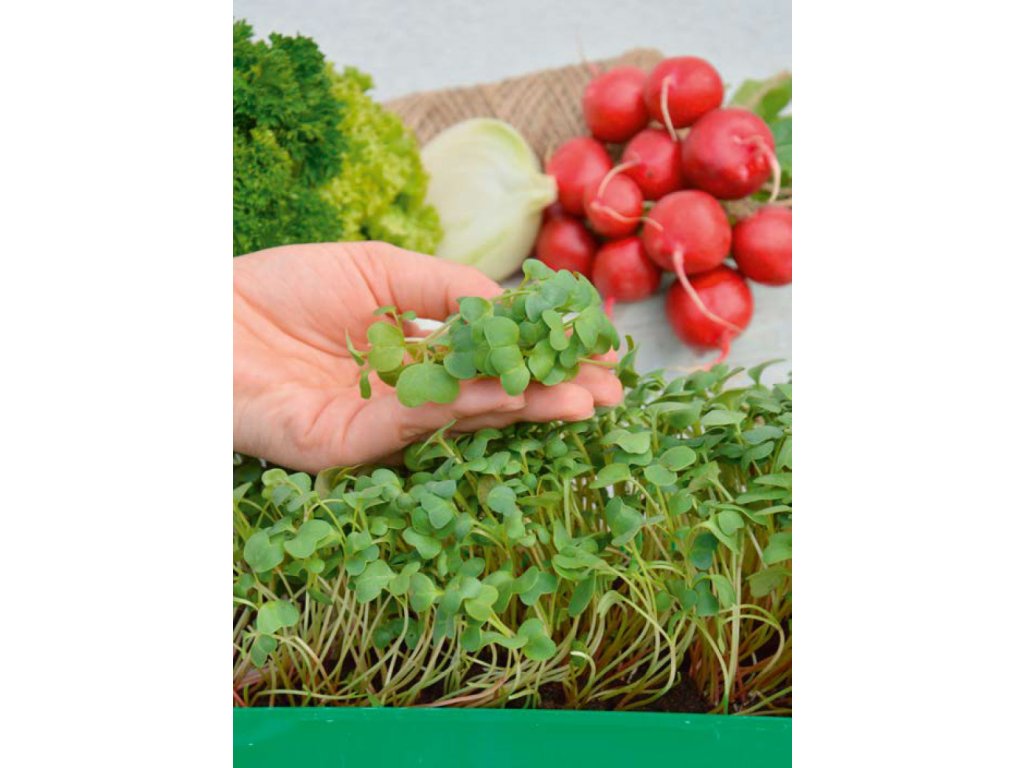 PESTOVANIE MIKROZELENINY: POZOR! Substrát by nemal byť počas celej kultivácie príliš vlhký. 1. Plochú nádobu naplňte zeminou, potom ju zarovnajte a zalejte. 2. Semená nasypte husto po celom povrchu. 3. Dvakrát denne pokropte vodou a pestujte 2-3 týždne. Rastliny zrežte, keď vytvoria prvé listy.