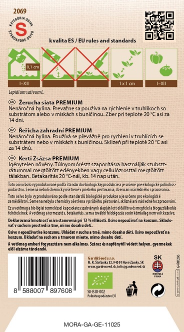 Toto osivo bolo vyprodukované podľa štandardov biologickej produkcie a je určené pre ekologické poľnohospodárstvo. Semená neboli chemicky ošetrené v priebehu pestovania, zberu ani následného spracovania.