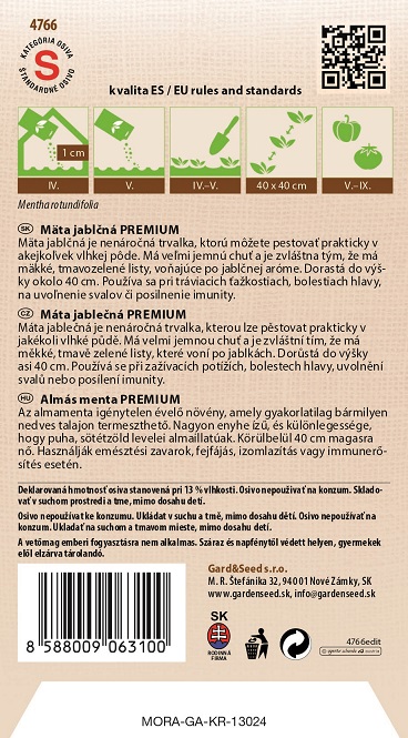 Mäta jablčná je nenáročná trvalka, ktorú môžete pestovať prakticky v akejkoľvek vlhkej pôde. Má veľmi jemnú chuť a je zvláštna tým, že má mäkké, tmavozelené listy, voňajúce po jablčnej aróme. Dorastá do výšky okolo 40 cm. Používa sa pri tráviacich ťažkostiach, bolestiach hlavy, na uvoľnenie svalov či posilnenie imunity.