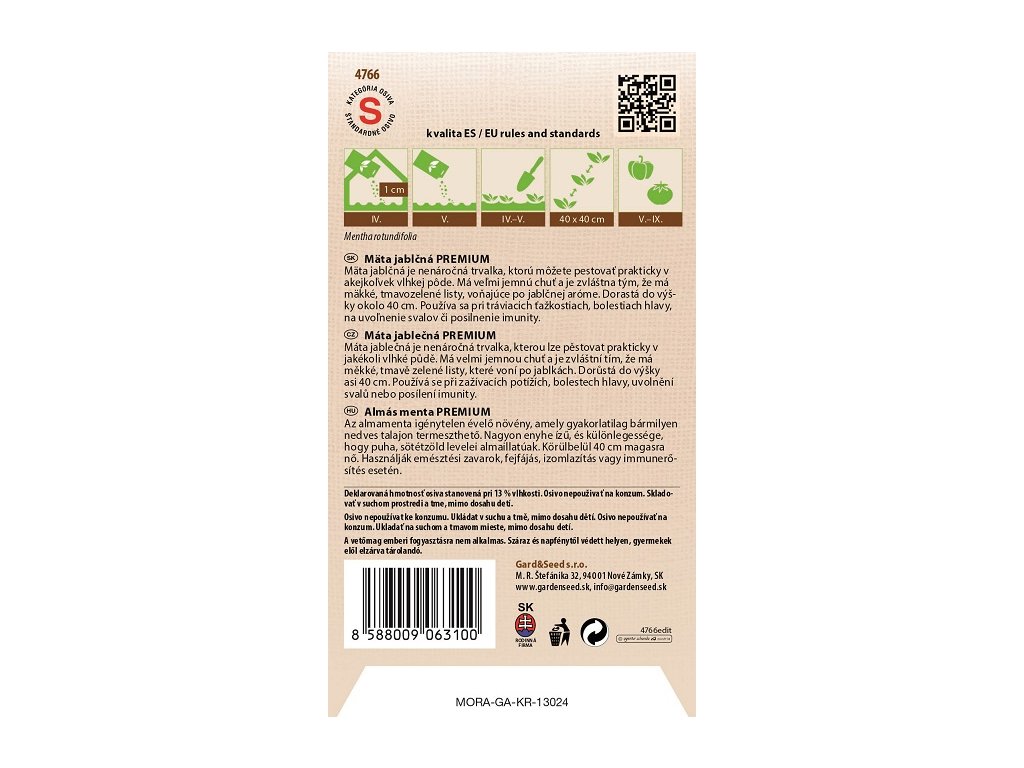 Mäta jablčná je nenáročná trvalka, ktorú môžete pestovať prakticky v akejkoľvek vlhkej pôde. Má veľmi jemnú chuť a je zvláštna tým, že má mäkké, tmavozelené listy, voňajúce po jablčnej aróme. Dorastá do výšky okolo 40 cm. Používa sa pri tráviacich ťažkostiach, bolestiach hlavy, na uvoľnenie svalov či posilnenie imunity.