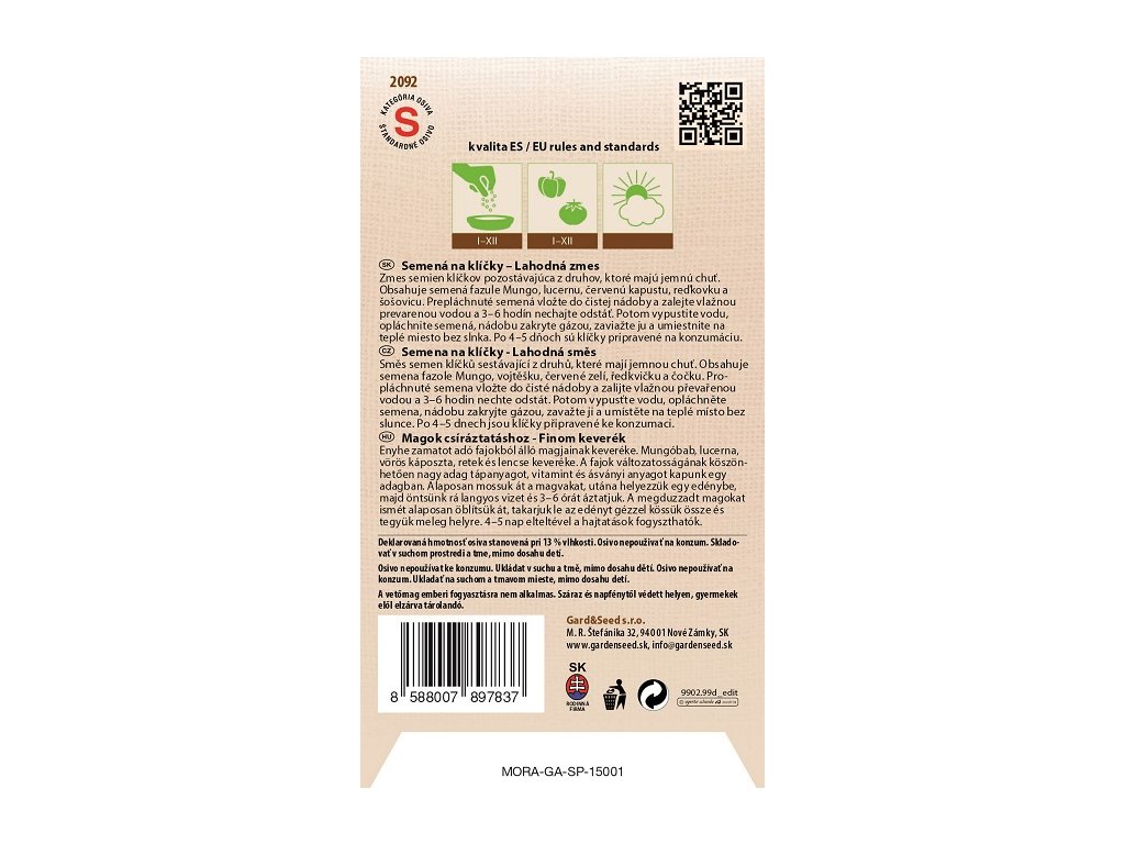 Obsahuje semená fazule Mungo, lucernu, červenú kapustu, reďkovku a šošovicu. Prepláchnuté semená vložte do čistej nádoby a zalejte vlažnou prevarenou vodou a 3–6 hodín nechajte odstáť. Potom vypustite vodu, opláchnite semená, nádobu zakryte gázou, zaviažte ju a umiestnite na teplé miesto bez slnka. Po 4–5 dňoch sú klíčky pripravené na konzumáciu.
