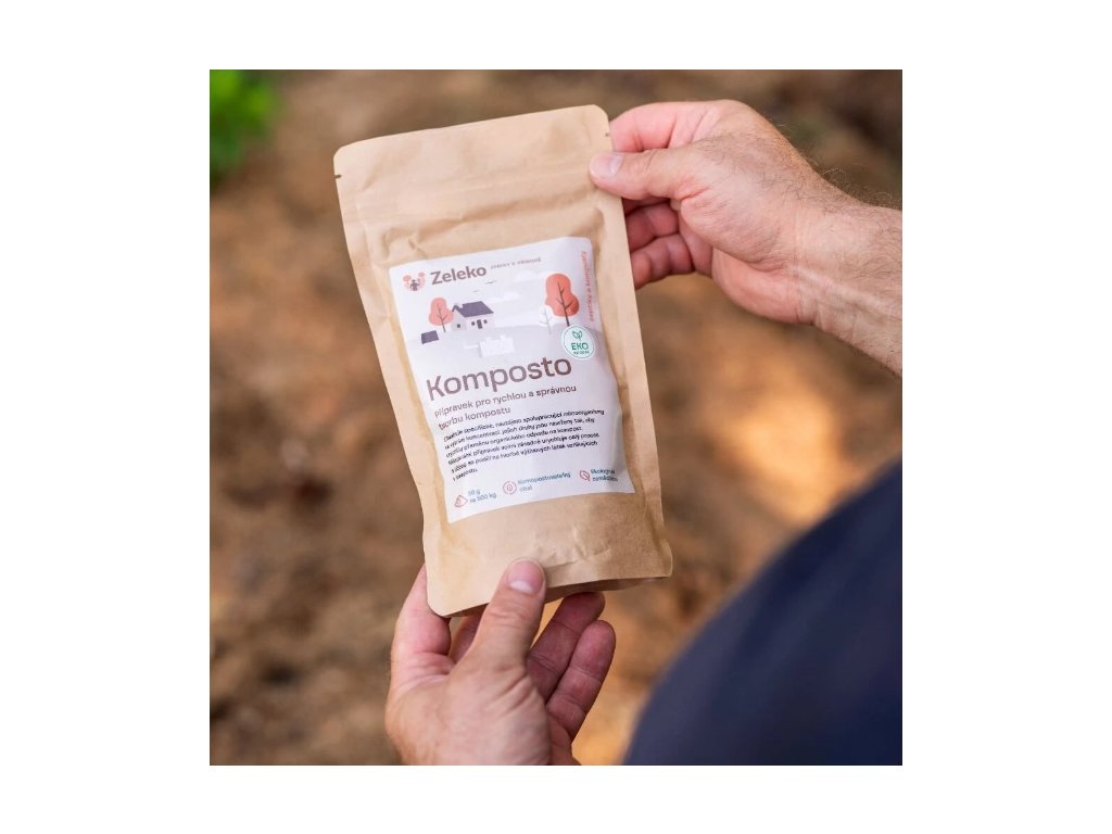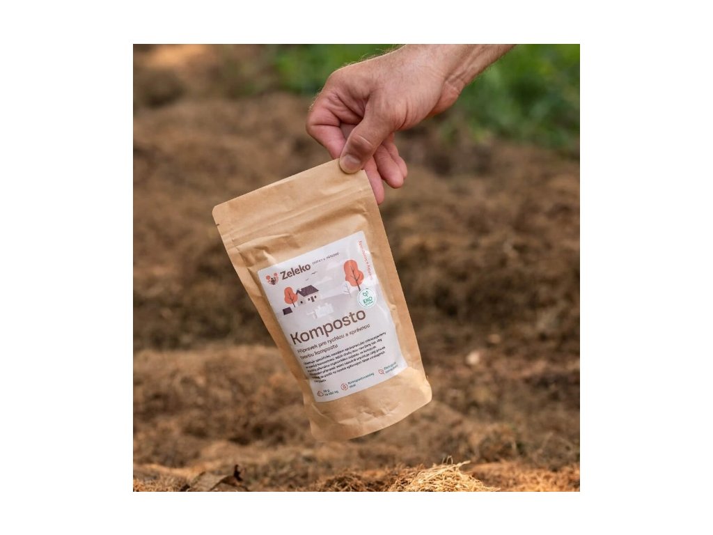 - Štartovacia dávka − na približne 500 kg (1m3) kompostu pridajte 50 g urýchľovača KOMPOSTO.